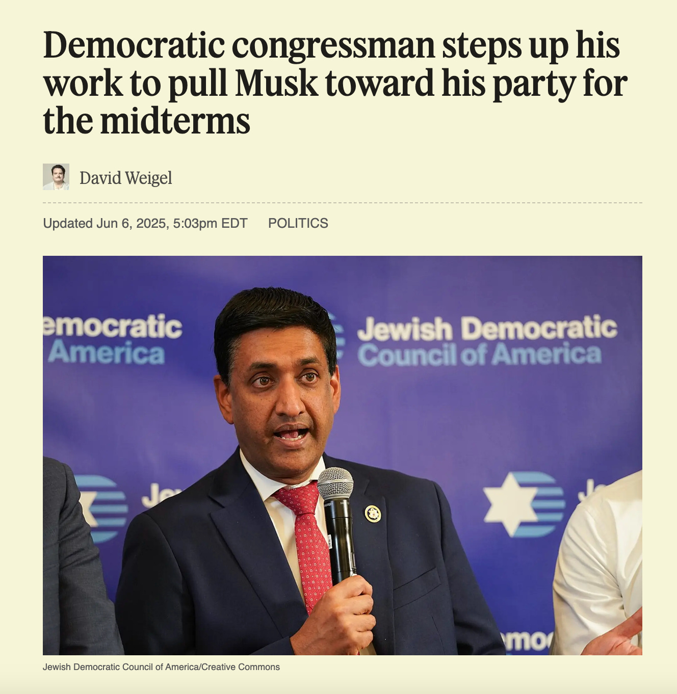 Rep. Ro Khanna, D-Calif., talked with one of Elon Musk’s “senior confidants” on Thursday about whether the ex-DOGE leader, now feuding with Donald Trump, might want to help the Democratic Party in the midterms.