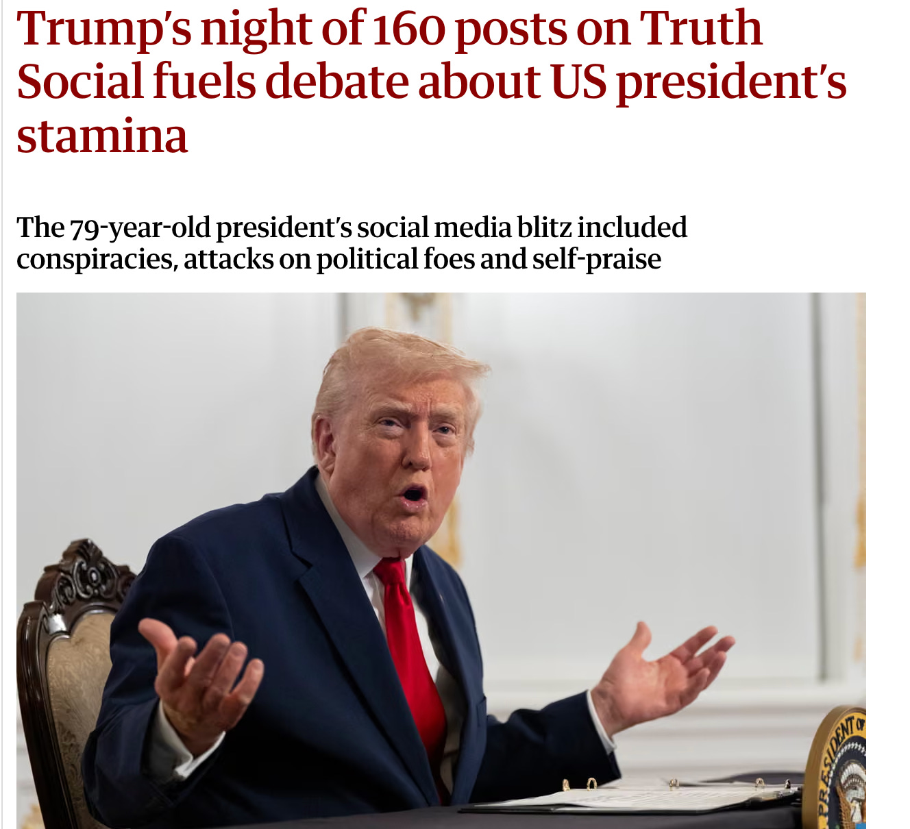 It could be late night, it could be in the middle of the day. This week, while he’s been bombarded with worsening news out of Minnesota, he posted over 50 times on Truth Social late Wednesday night.